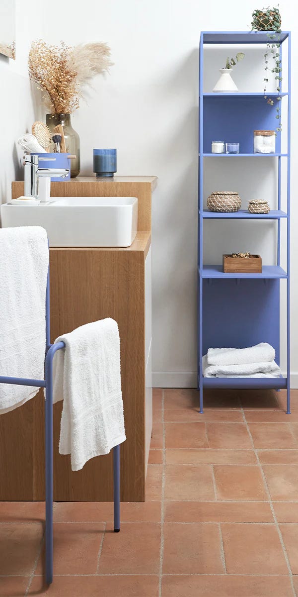 On the left we have a standard bathroom. Calm atmosphere with the products highlighted by their color which, even if pastel, stands out well. On the right we have a minimal black and white wall with some bathroom products on it.